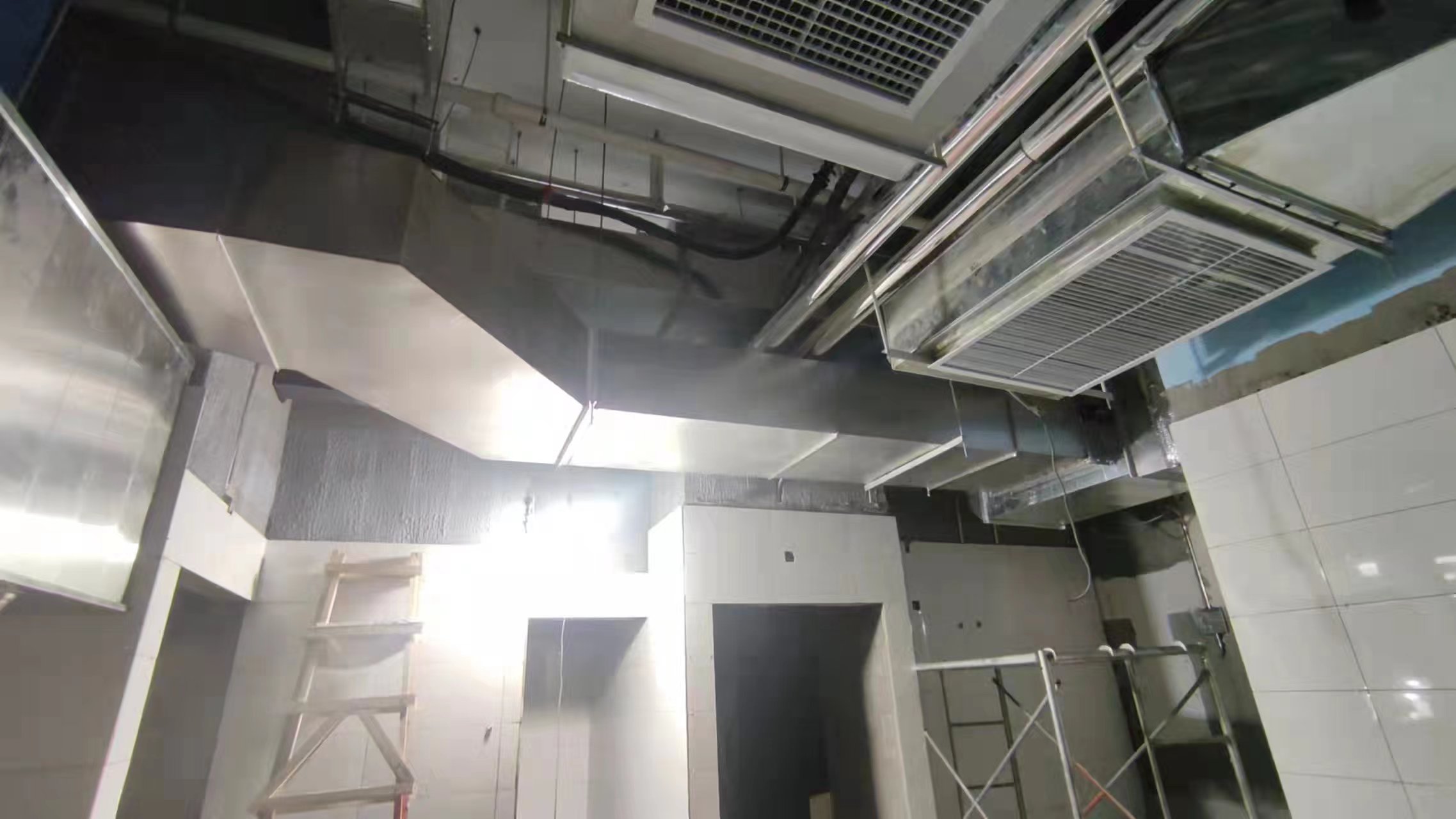 安装完的风管要保证表面光滑洁净,室外风管应有防雨、防雪措施。 风管伸入结构风道时,其末端应安装上钢板网,防止系统运行时,杂物进入金 属风管内。